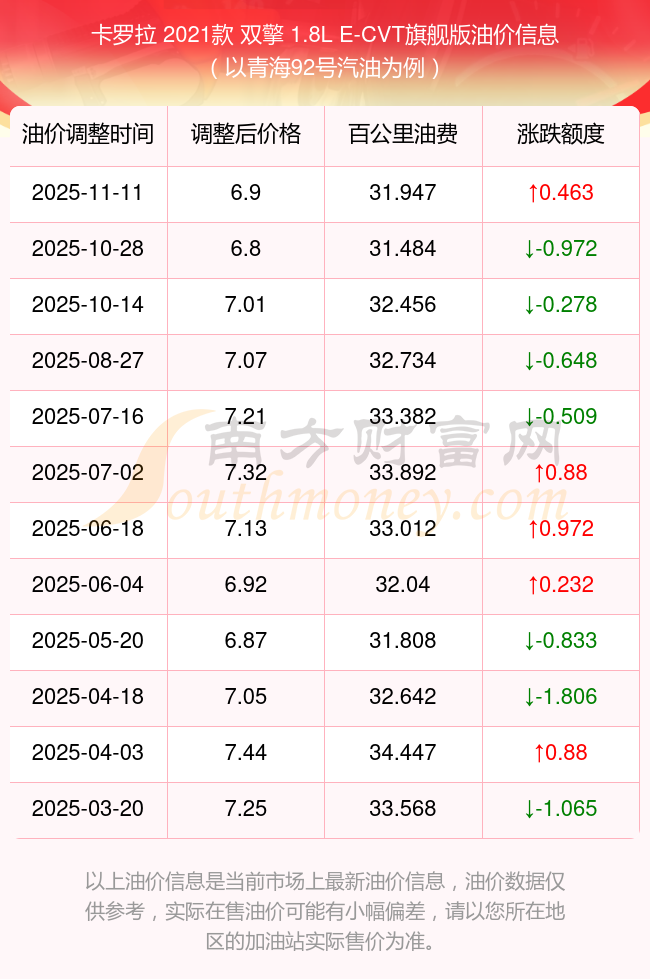 根据11月11日92号汽油最新调整价格6.9元/升来计算(以青海为例),该车型每百公里的平均油费是31.947元,上一轮10月28日调整价格6.8元每升来计算,每百公里的平均油费是31.484元,对比上一轮多花0.463元,下一轮的油价调整时间是11月24日24时。