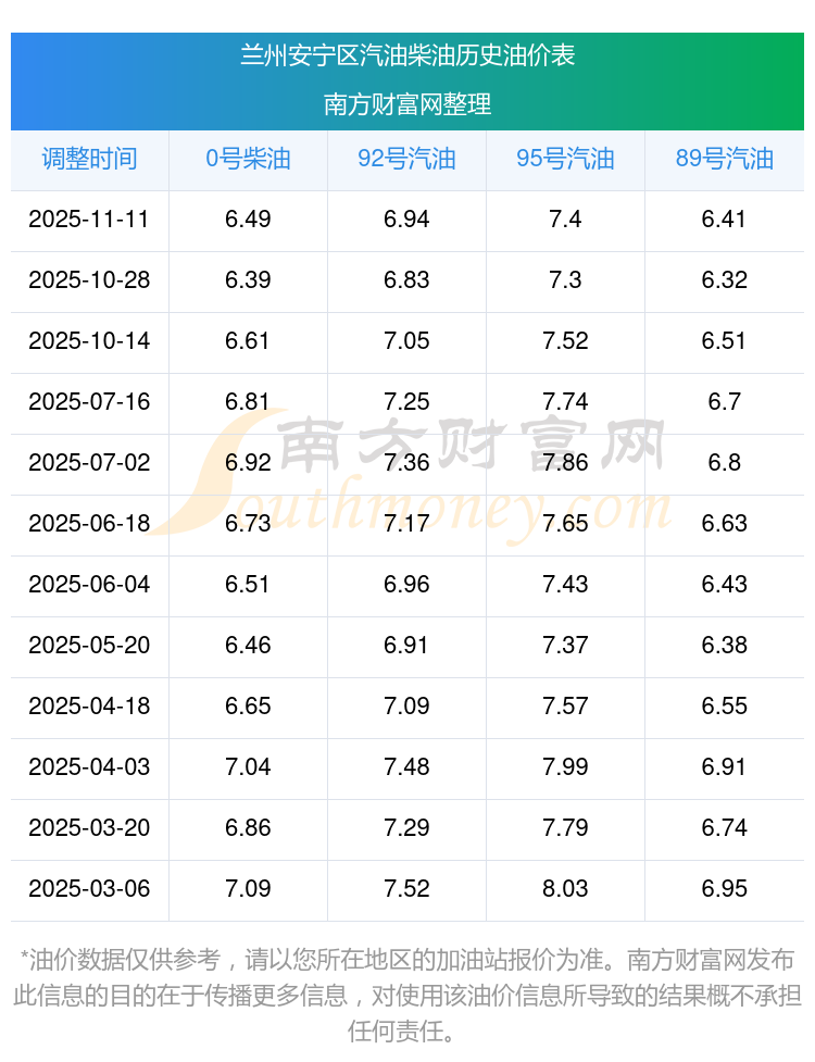 11月22日兰州安宁区汽油柴最新油价是多少?具体每升为:11月11日调整后,92号汽油为6.94元,上涨了0.11元,上涨幅达1.61%;95号汽油为7.4元,上涨了0.1元,上涨幅达1.37%;89号汽油为6.41元,上涨了0.09元,上涨幅达1.42%;0号柴油为6.49元,上涨了0.1元,上涨幅达1.57%。