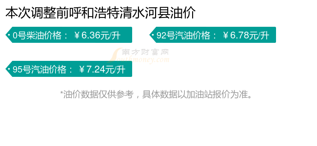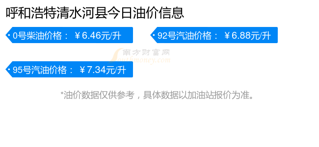 呼和浩特清水河县汽油、柴油11月22日价格多少钱一升?具体为:0号柴油为6.46元,上涨了0.1元;95号汽油为7.34元;92号汽油为6.88元;,调整时间为11月11日。