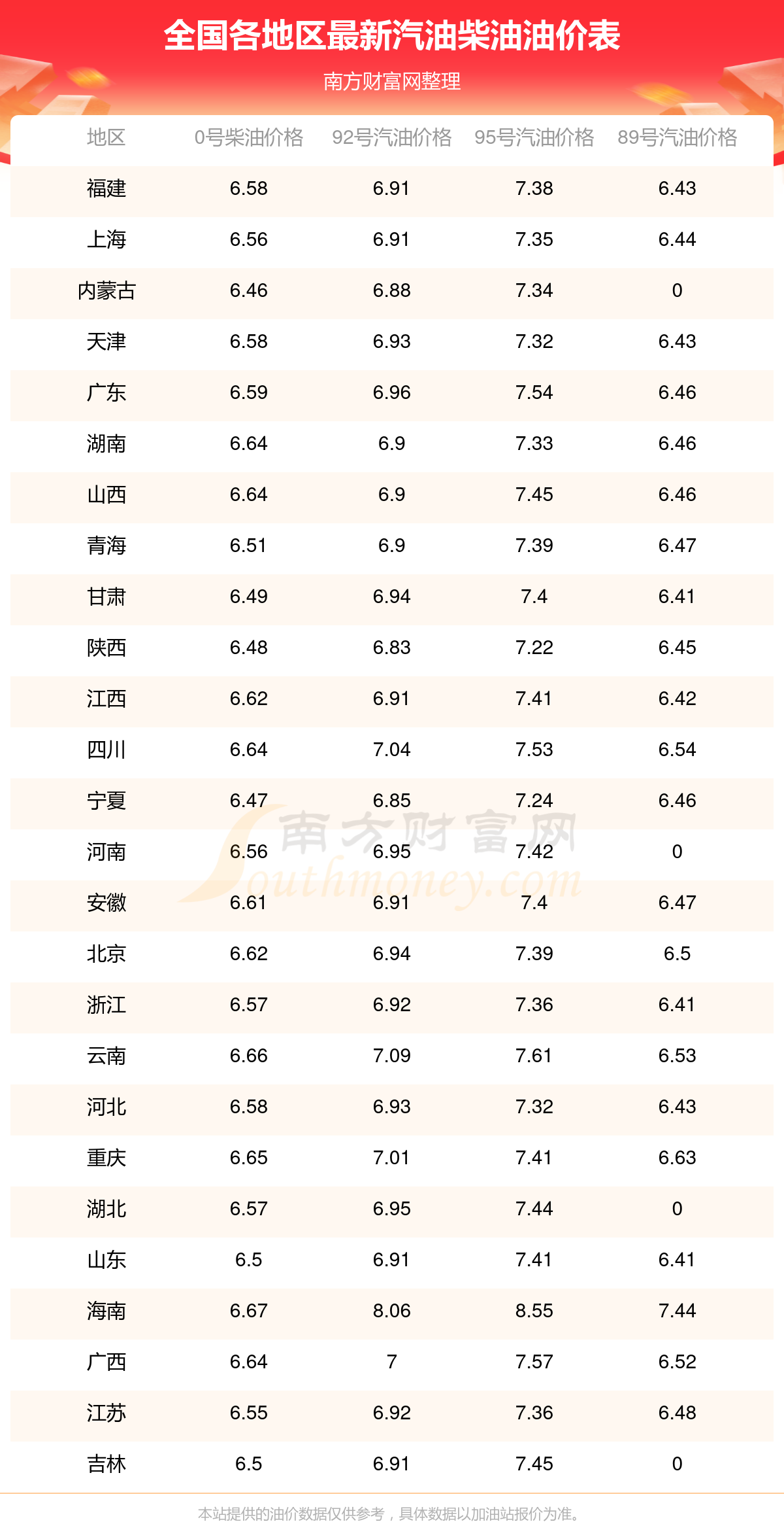 全国89号汽油最新平均价格为:7元每升,其中,最高为海南,价格为7.44元/升,最低为浙江,价格为6.41元/升。