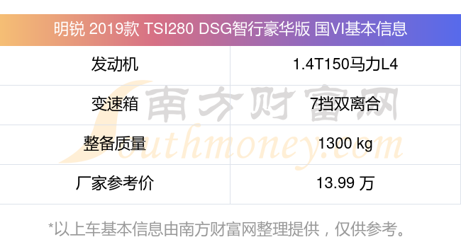 明锐 2019款 TSI280 DSG智行豪华版 国VI搭载了一台1.4T150马力L4涡轮增压发动机,采用7挡双离合自动档变速箱,常规整备质量1300kg,厂家参考价13.99万元。