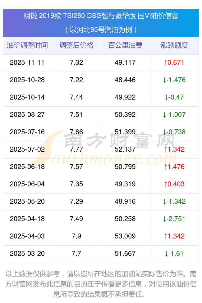 按照11月11日95号汽油最新调整价格7.32元/升来计算(以河北为例),该车型百公里平均油费为49.117元,按照上一轮10月28日调整价格7.22元/升来计算,百公里平均油费为48.446元,对比上一轮多花0.671元,下一轮油价调整时间为11月24日24时。