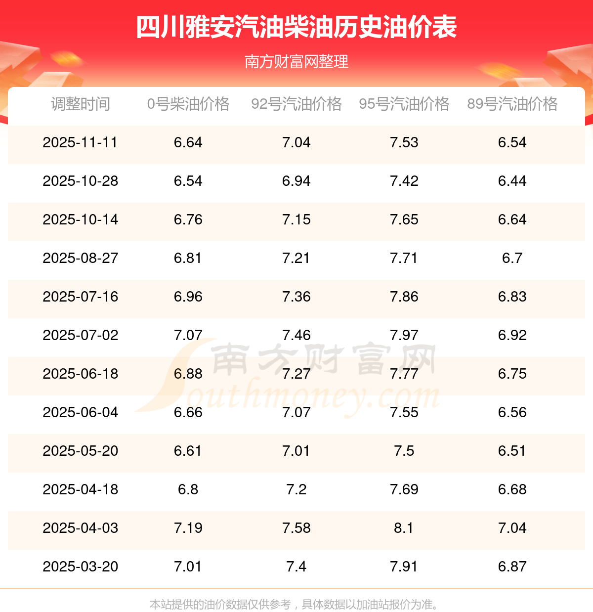 汽油、柴油11月22日每升的价格为(本轮油价调整时间为11月11日):92号汽油7.04元;95号汽油7.53元;89号汽油6.54元;0号柴油6.64元。下一轮油价调整时间11月24日24时,距离现在还有2.26天。