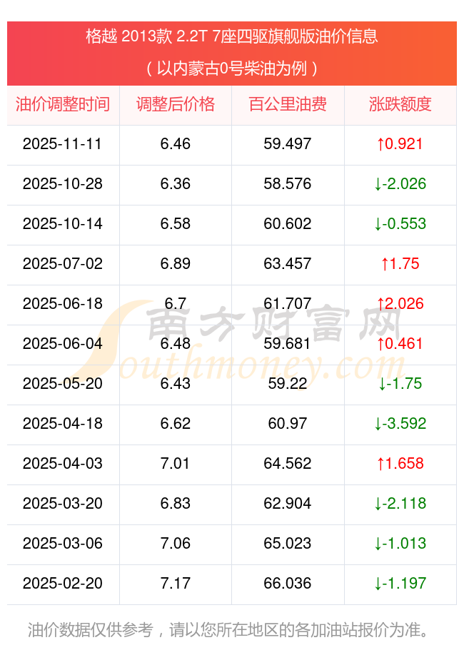 按11月11日0号柴油最新调整价格6.46元每升来计算(以内蒙古为例),该车型百公里平均油费为59.497元,按上一轮10月28日调整价格6.36元每升来计算,百公里平均油费为58.576元,对比上一轮多花0.921元,下一轮油价调整时间为11月24日24时。