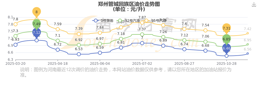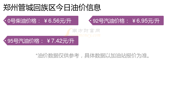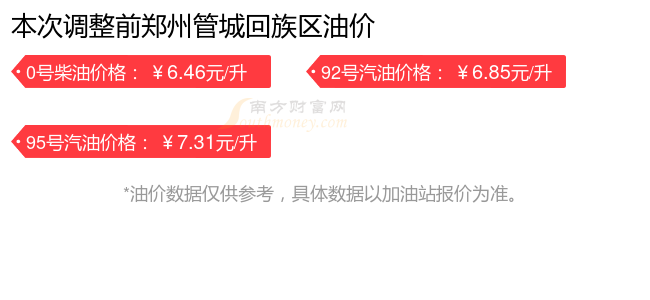 11月22日,郑州管城回族区汽油、柴油每升最新价格:调整时间为11月11日,92号汽油为6.95元,上调了0.1元,上调幅达1.46%;95号汽油为7.42元,上调了0.11元,上调幅达1.51%;0号柴油为6.56元,上调了0.1元,上调幅达1.55%。