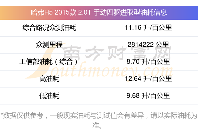 根据多位车主实测得出数据,该车型低油耗为9.68升/百公里,高油耗为12.64升/百公里,综合路况众测油耗为11.16升/百公里,工信部综合油耗为8.70升/百公里。