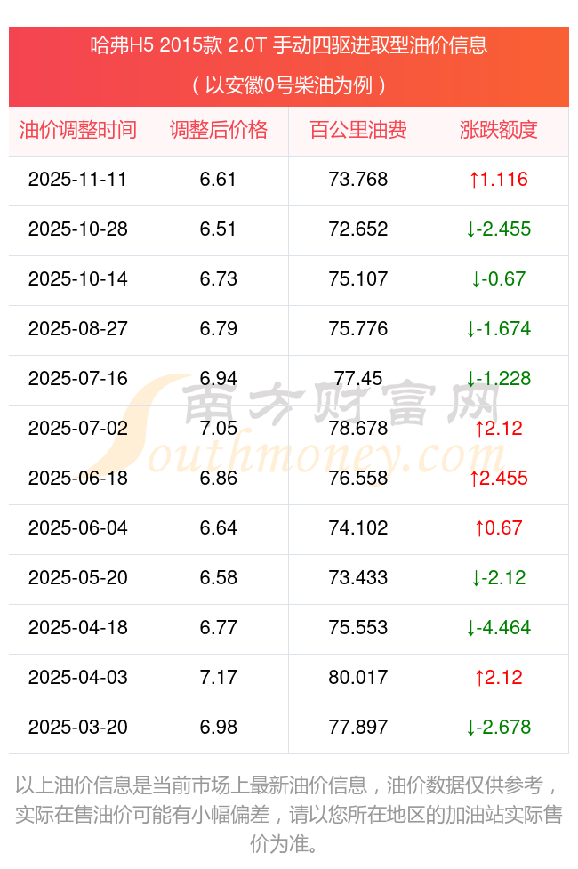 依照11月11日0号柴油最新调整价格6.61元/升来计算(以安徽为例),该车型百公里的平均油费是73.768元,依照上一轮10月28日调整价格6.51元/升来计算,百公里的平均油费是72.652元,对比上一轮多花1.116元,下一轮的油价调整时间11月24日24时。