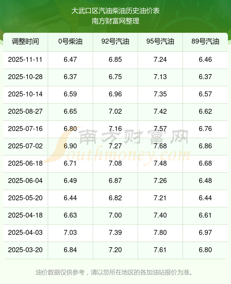 油价调整最新消息:下一轮油价调整时间11月24日24时。大武口区汽油、柴油11月22日每升的价格为(油价调整时间是11月11日):92号汽油6.85元;95号汽油7.24元;89号汽油6.46元;0号柴油6.47元。