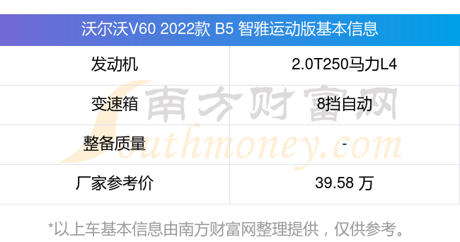 沃尔沃V60 2022款 B5 智雅运动版动力上搭载的是一台2.0T250马力L4涡轮增压发动机,匹配8挡自动档变速箱,燃料形式为汽油+48V轻混系统,厂家参考价39.58万元。