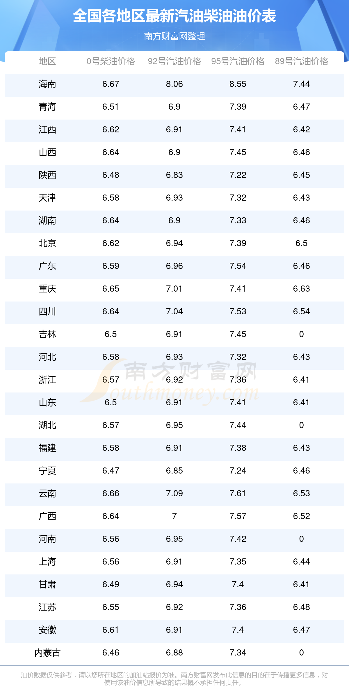 0号柴油平均价格:7元每升,其中,最高为海南,价格为6.67元/升,最低为内蒙古,价格为6.46元/升。