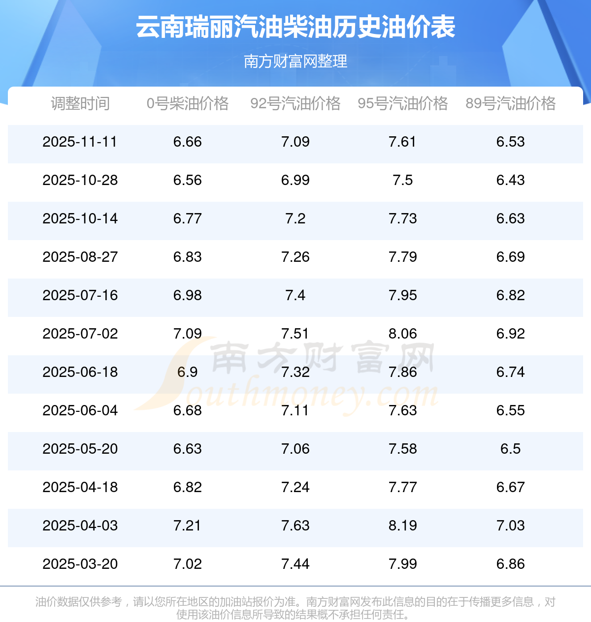 以上数据仅供参考,请以您所在地区的加油站实际售价为准。开云手机web版登录入口发布此信息的目的在于传播更多信息,对使用该油价信息所导致的结果概不承担责任。