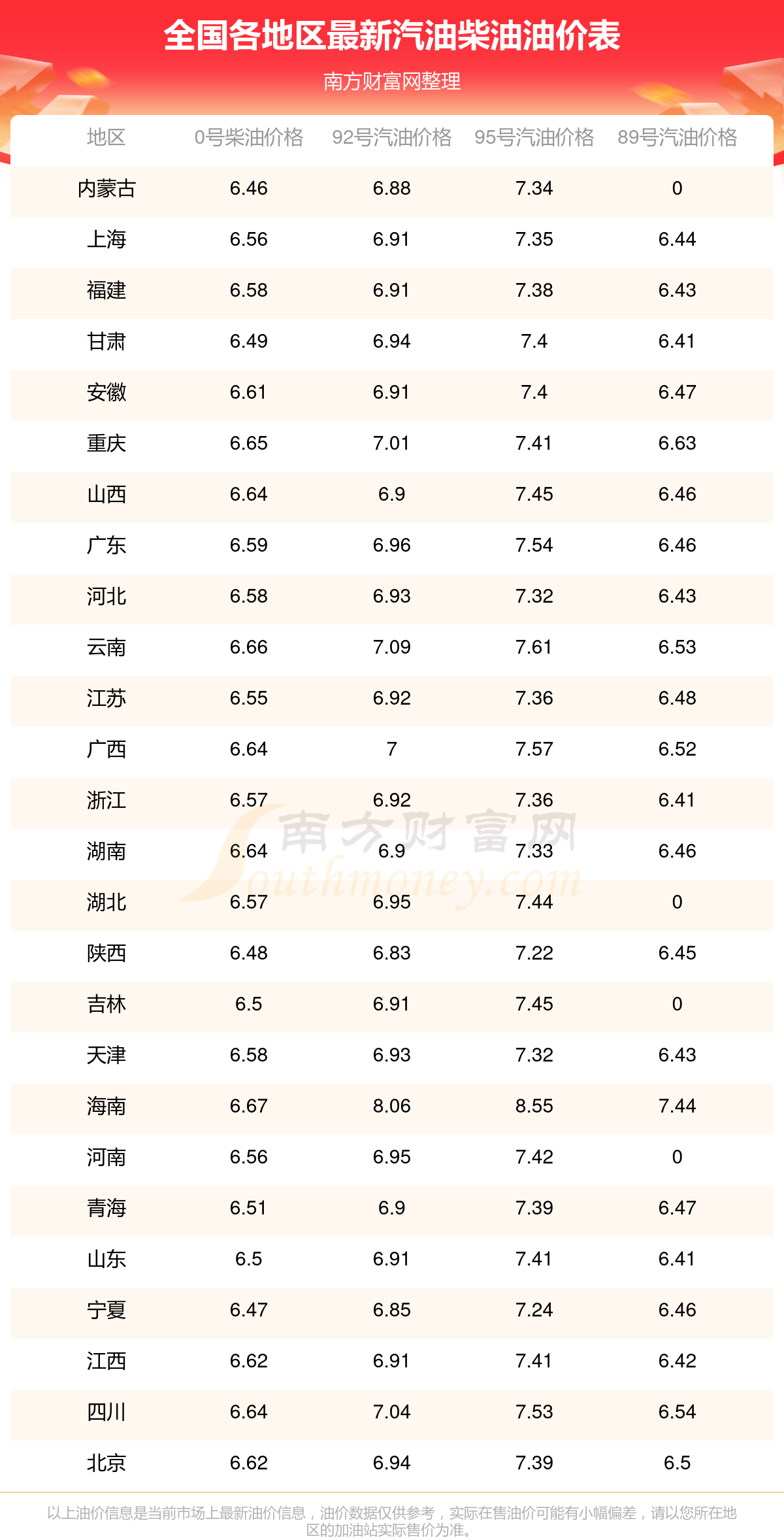 全国各地区2025年最新汽油价格表