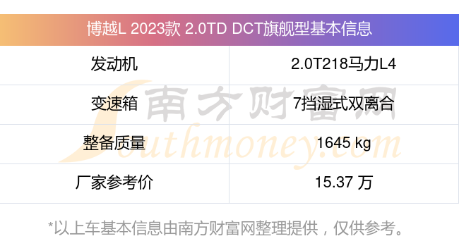 博越L 2023款 2.0TD DCT旗舰型动力上配备的是一台2.0T218马力L4涡轮增压发动机,匹配的是7挡湿式双离合自动档变速箱,燃料形式为汽油,常规整备质量1645kg,厂家参考价15.37万元。