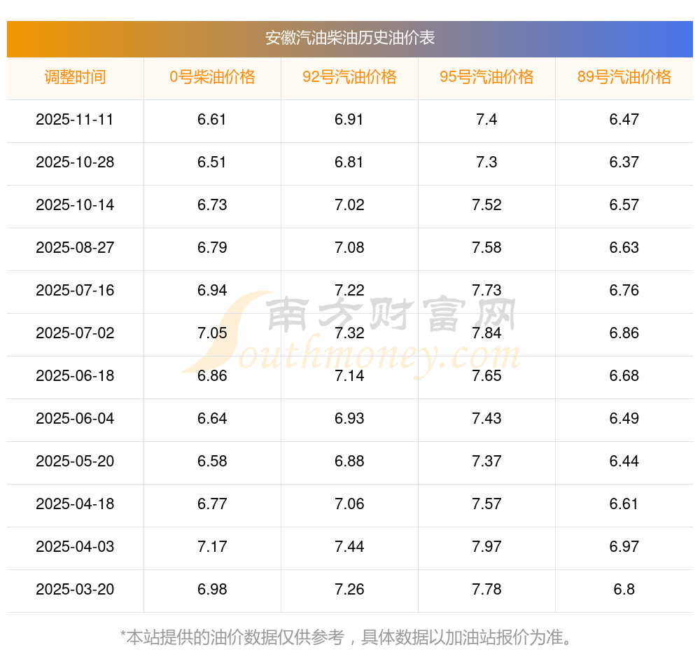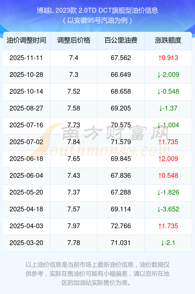 按11月11日95号汽油最新调整价格7.4元每升来计算(以安徽为例),该车型百公里平均油费为67.562元,按上一轮10月28日调整价格7.3元每升来计算,百公里平均油费为66.649元,对比上一轮多花0.913元,下一轮油价调整时间为11月24日24时。