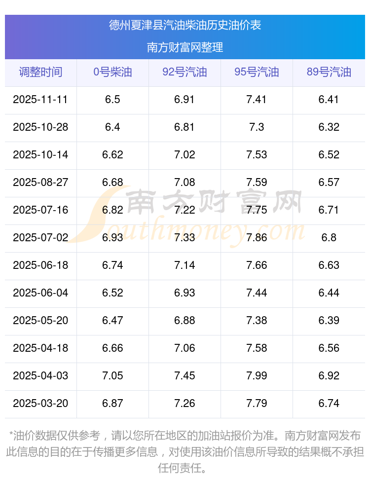 德州夏津县历史油价表