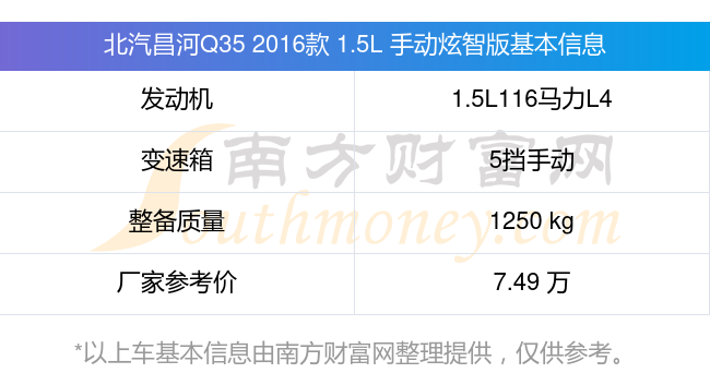 北汽昌河Q35 2016款 1.5L 手动炫智版动力方面,搭载的是一台1.5L116马力L4自然吸气发动机,匹配5挡手动挡变速箱,燃料形式为汽油,常规整备质量1250kg,厂家参考价7.49万元。