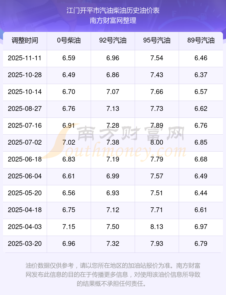 江门开平市汽油、柴油11月22日每升的价格(油价调整时间11月11日):92号汽油6.96元;95号汽油7.54元;89号汽油6.46元;0号柴油6.59元。