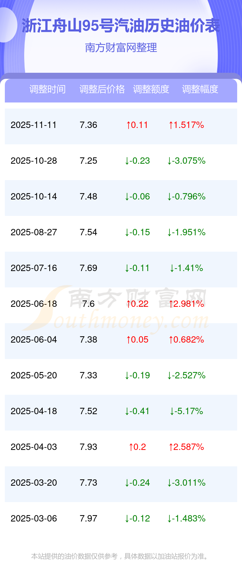 11月22日浙江舟山95号汽油价格查询:每升7.36元(11月11日油价调整后的价格),相对上次调整时间10月28日的油价7.25元每升,上调了0.11元,上调1.517%。