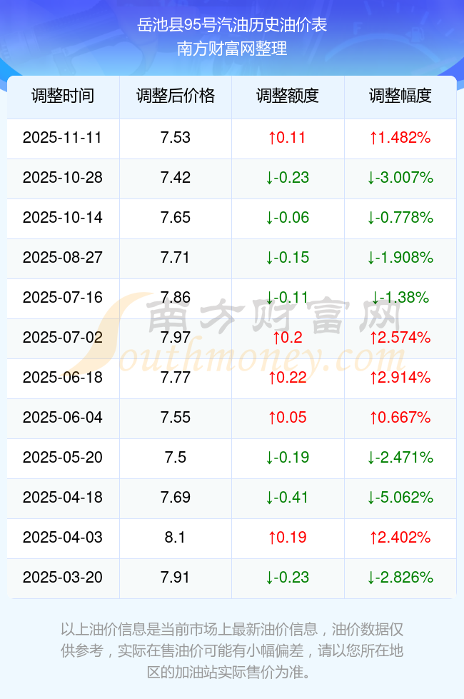 岳池县汽油、柴油11月22日每升的价格(油价调整时间11月11日):92号汽油7.04元;95号汽油7.53元;89号汽油6.54元;0号柴油6.64元。