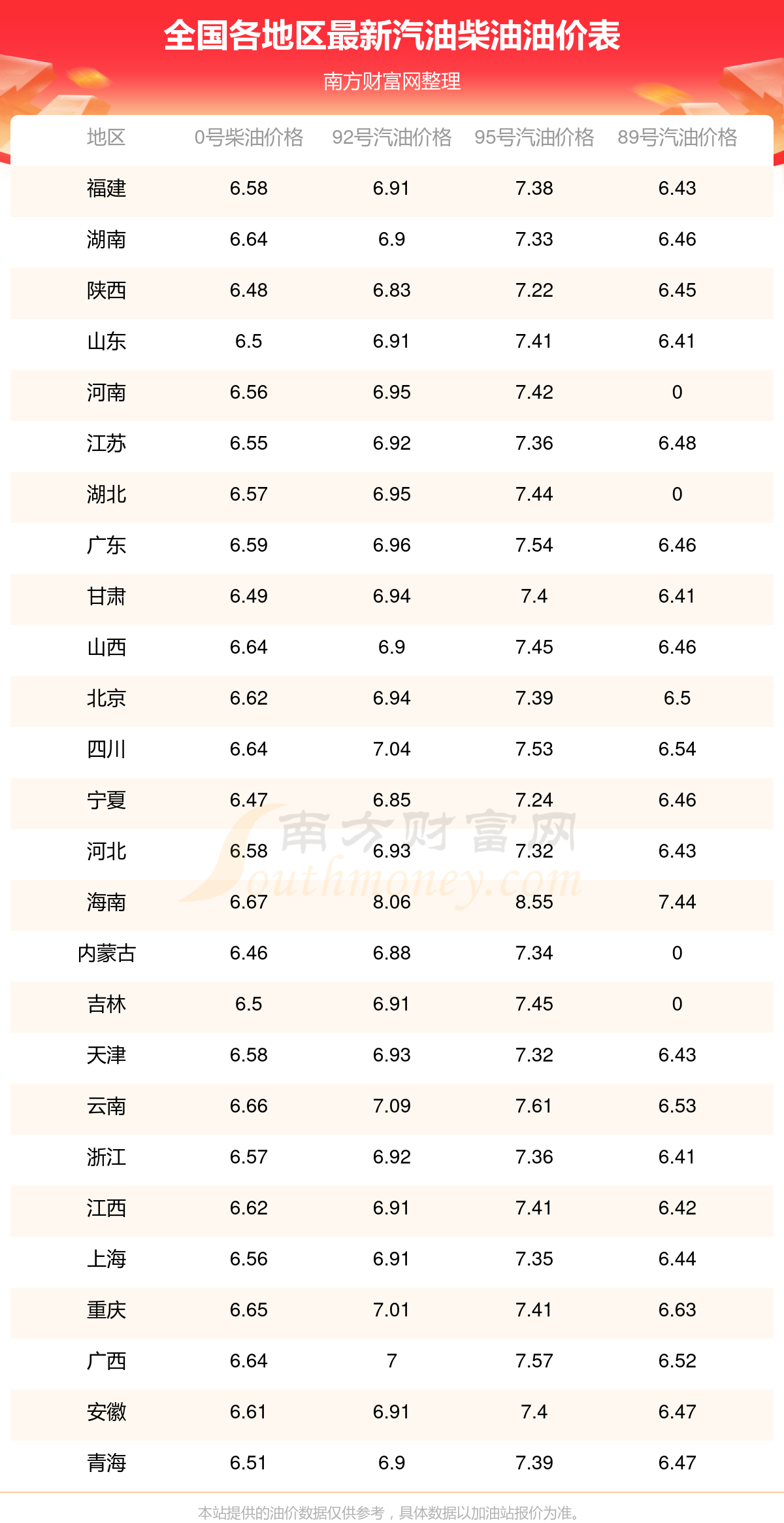 汽油价格调整最新消息:下一轮油价调整11月24日24时开启。油价最新调整时间为11月11日 ,全国92号汽油最新平均价格为:7元每升,其中,最高为海南,价格为8.06元/升,最低为陕西,价格为6.83元/升。全国95号汽油最新平均价格为:7元每升,其中,最高为海南,价格为8.55元/升,最低为陕西,价格为7.22元/升。全国0号柴油最新平均价格为:7元每升,其中,最高为海南,价格为6.67元/升,最低为内蒙古,价格为6.46元/升。全国89号汽油最新平均价格为:7元每升,其中,最高为海南,价格为7.44元/升,最低为浙江,价格为6.41元/升。