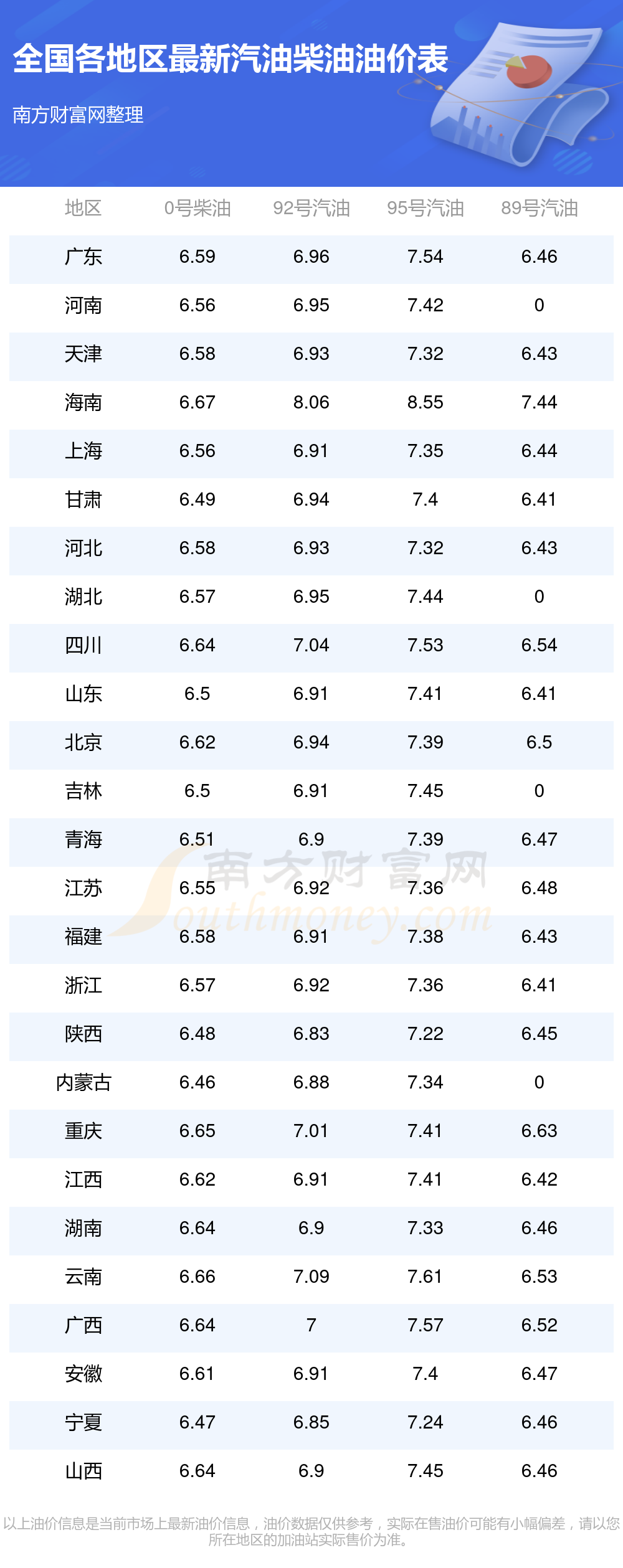 以上油价信息是当前市场上最新油价信息,油价数据仅供参考,实际在售油价可能有小幅偏差,请以您所在地区的加油站实际售价为准。