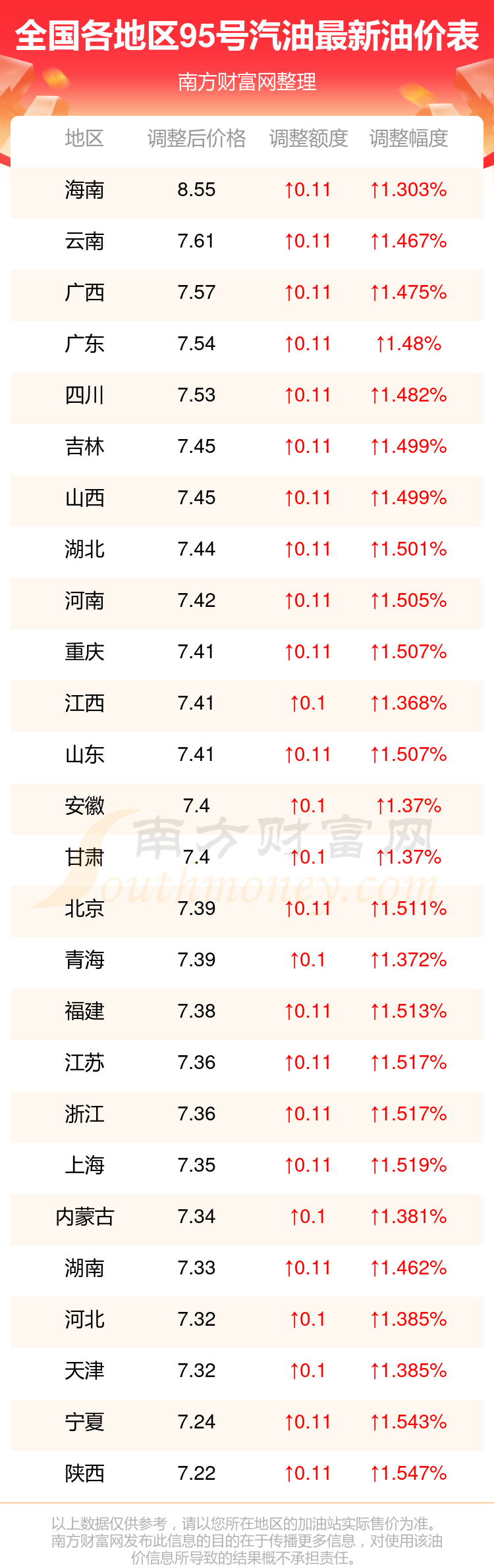 以上油价信息是当前市场上最新油价信息,油价数据仅供参考,实际在售油价可能有小幅偏差,请以您所在地区的加油站实际售价为准。