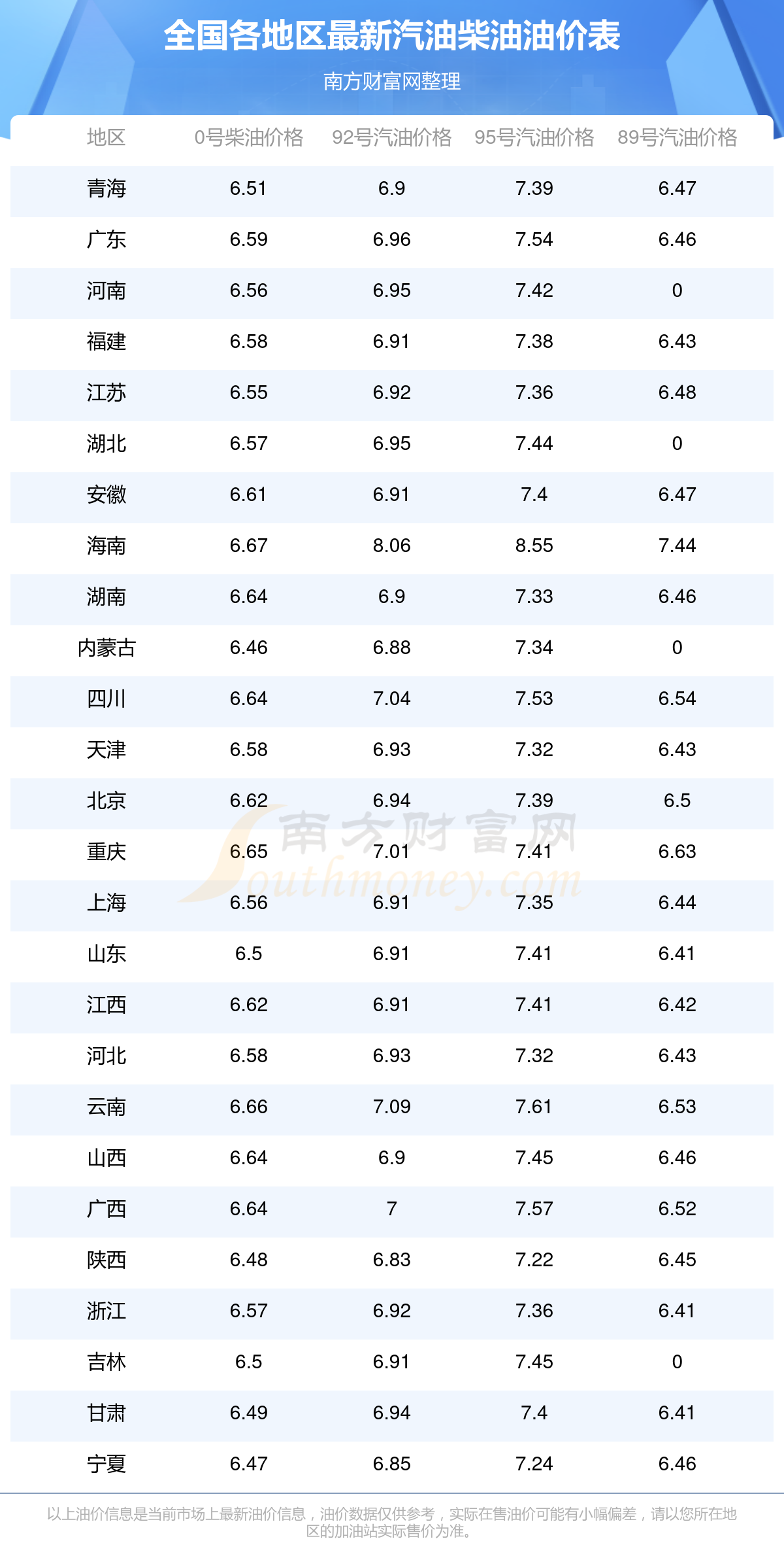 0号柴油平均价格:7元每升,其中,最高为海南,价格6.67元/升,最低为内蒙古,价格6.46元/升。