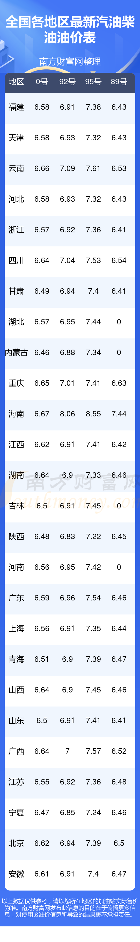 以上油价信息是当前市场上最新油价信息,油价数据仅供参考,实际在售油价可能有小幅偏差,请以您所在地区的加油站实际售价为准。