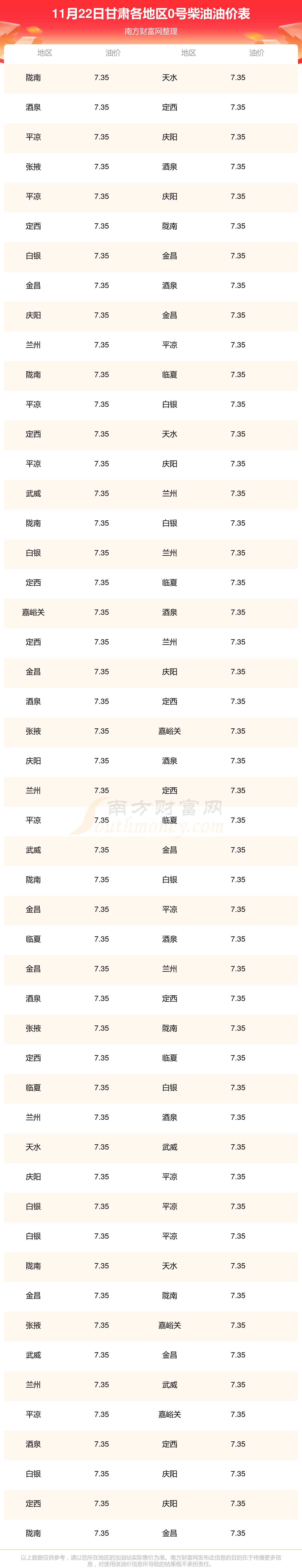 甘肃各地区最新0号柴油油价表