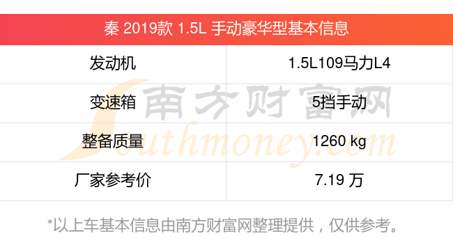 在动力上,秦 2019款 1.5L 手动豪华型配备的是一台1.5L109马力L4自然吸气发动机,匹配的是5挡手动挡变速箱,燃料形式为汽油,常规整备质量1260kg,厂家参考价7.19万元。