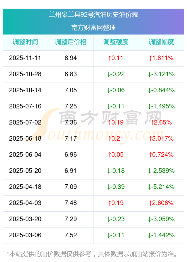 11月22日的兰州皋兰县汽油、柴油每升最新价格(调整时间为11月11日):92号汽油为6.94元,上升了0.11元,上升幅达1.61%;95号汽油为7.4元,上升了0.1元,上升幅达1.37%;89号汽油为6.41元,上升了0.09元,上升幅达1.42%;0号柴油为6.49元,上升了0.1元,上升幅达1.57%。