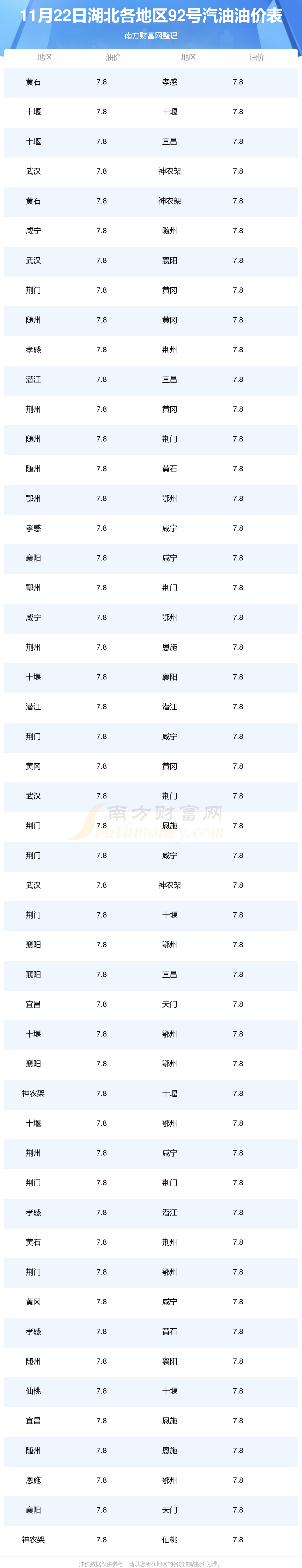 11月22日湖北92号汽油的油价为11月11日调整后的价格,具体是6.95元/升,对比上次油价调整增了0.1元,增1.46%。
