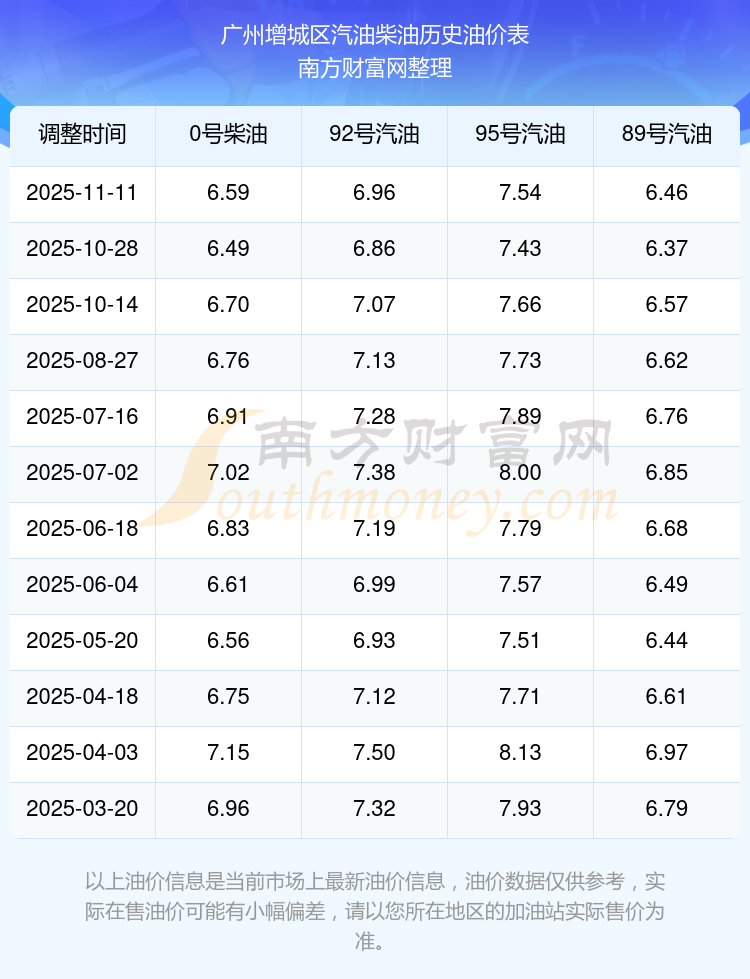 广州增城区汽油、柴油11月22日每升的价格为(本轮油价调整时间为11月11日):92号汽油6.96元;95号汽油7.54元;89号汽油6.46元;0号柴油6.59元。