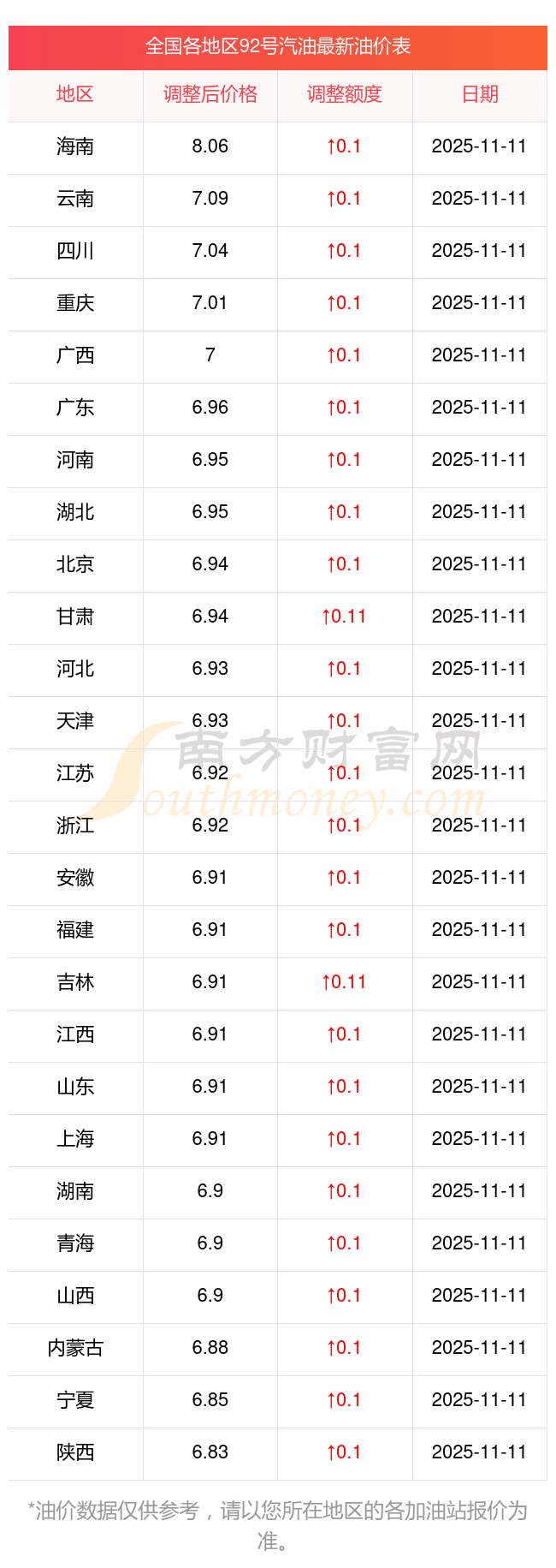 全国各地区92号汽油油价一览表