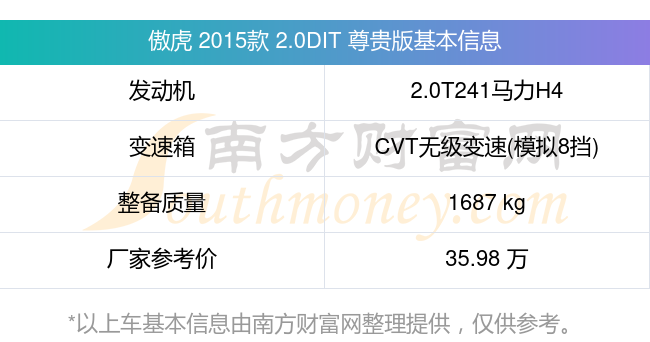 傲虎 2015款 2.0DIT 尊贵版动力上配备的是一台2.0T241马力H4涡轮增压发动机,匹配的是CVT无级变速(模拟8挡)自动档变速箱,燃料形式为汽油,常规整备质量1687kg,厂家参考价35.98万元。