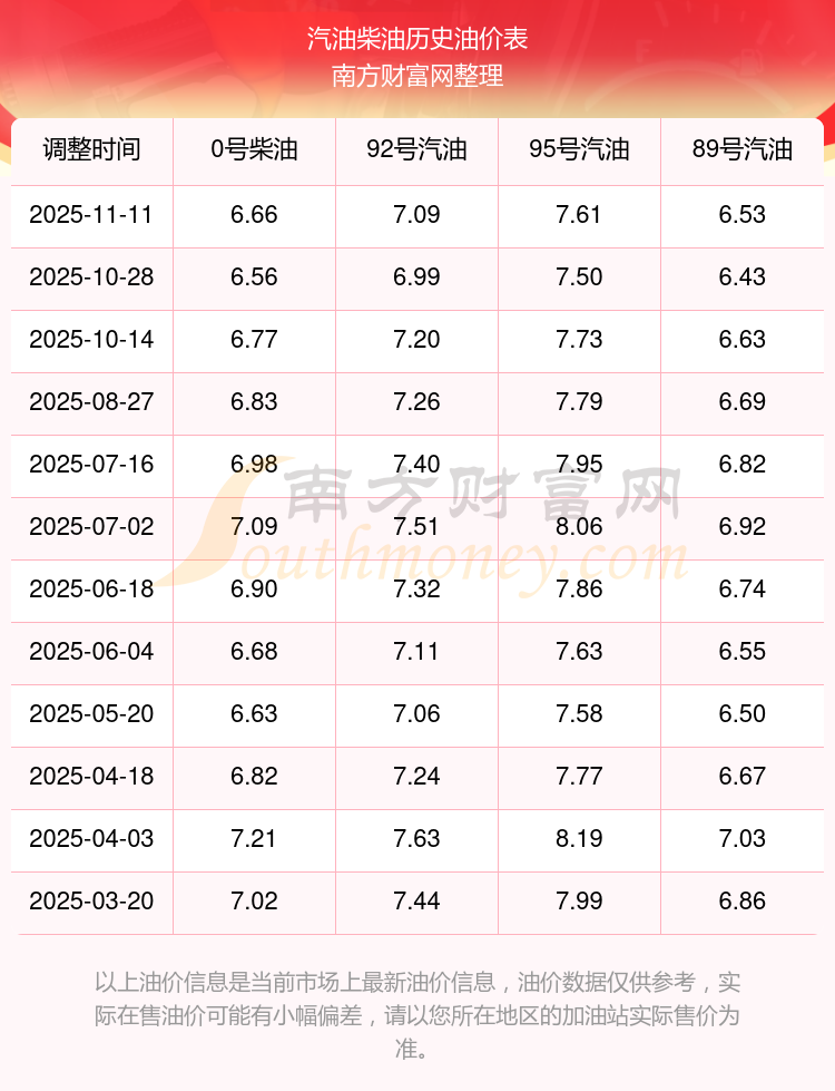 大理汽油、柴油11月22日每升最新价格为:95号汽油为7.61元,上升了0.11元;92号汽油为7.09元,上升了0.1元;89号汽油为6.53元,上升了0.1元;0号柴油为6.66元,上升了0.1元,调整时间为11月11日。下一轮油价调整时间11月24日24时,距离现在还有2.08天。