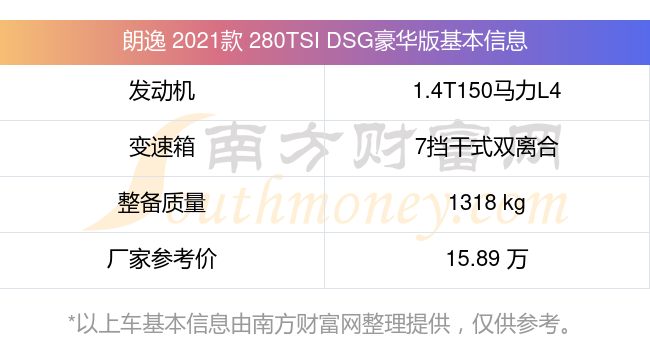 在动力方面,朗逸 2021款 280TSI DSG豪华版搭载的是一台1.4T150马力L4涡轮增压发动机,匹配7挡干式双离合自动档变速箱,燃料形式为汽油,常规整备质量1318kg,厂家参考价15.89万元。