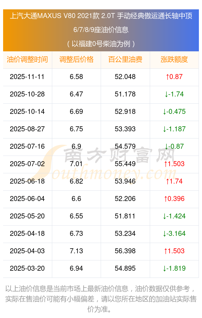 根据11月11日0号柴油最新调整价格6.58元/升来计算(以福建为例),该车型每百公里的平均油费是52.048元,上一轮10月28日调整价格6.47元每升来计算,每百公里的平均油费是51.178元,对比上一轮多花0.87元,下一轮的油价调整时间是11月24日24时。