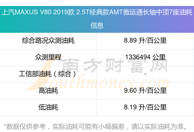 根据多位车主实测得出数据,该车型低油耗为8.19L/100km,高油耗为9.60L/100km,综合路况众测油耗为8.89L/100km,工信部综合油耗为-L/100km。