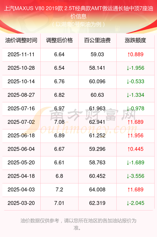 按照11月11日0号柴油最新调整价格6.64元/升来计算(以湖南为例),该车型百公里平均油费为59.03元,按照上一轮10月28日调整价格6.54元/升来计算,百公里平均油费为58.141元,对比上一轮多花0.889元,下一轮油价调整时间为11月24日24时。