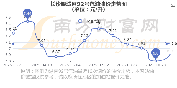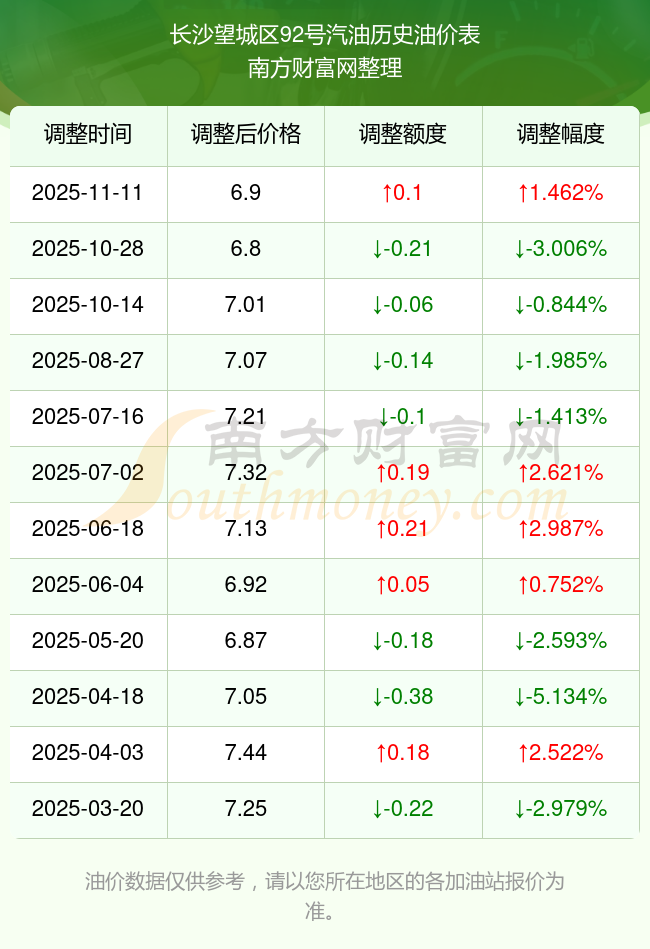 长沙望城区92号汽油11月22日最新价格为6.9元每升,本轮油价调整时间为11月11日,相对上次调整时间10月28日的油价6.8元每升,共增了0.1元,增1.462%。