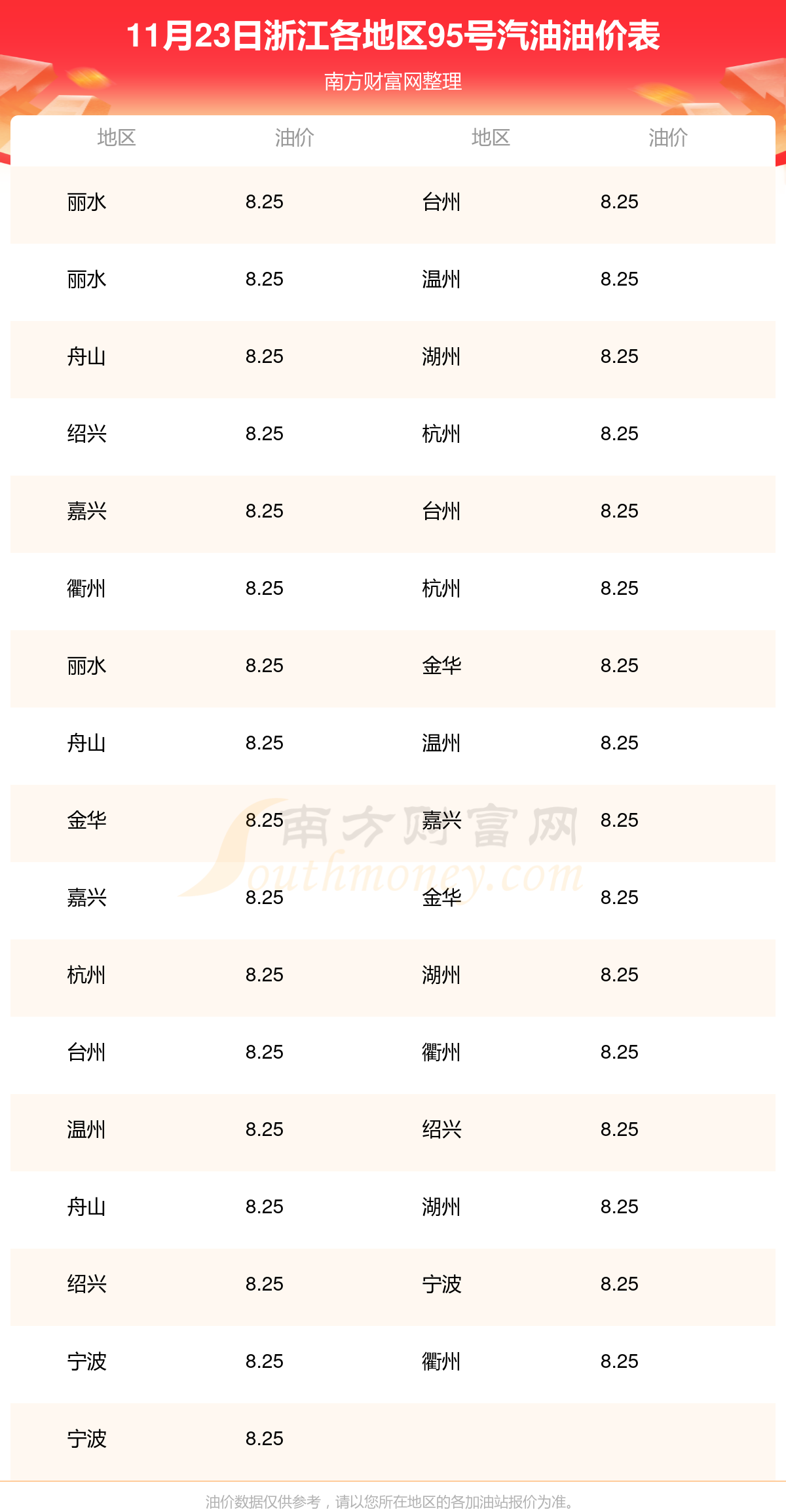 11月23日,浙江95号汽油的价格是7.36元每升,本次的调整时间为11月11日,对比上次的调整上升了0.11元,上升1.517%,下次调整时间为11月24日24时,还有1.88天。