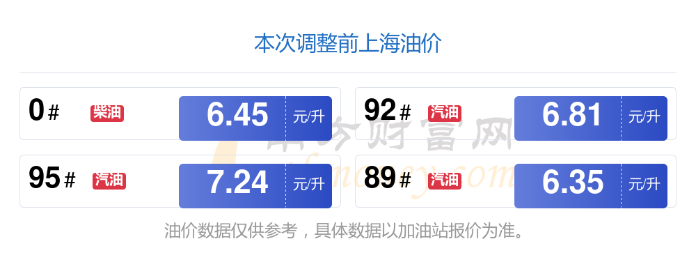 11月23日,上海汽油、柴油每升最新价格为:调整时间为11月11日,92号汽油为6.91元,上调了0.1元,上调幅达1.47%;95号汽油为7.35元,上调了0.11元,上调幅达1.52%;89号汽油为6.44元,上调了0.09元,上调幅达1.42%;0号柴油为6.56元,上调了0.11元,上调幅达1.71%。