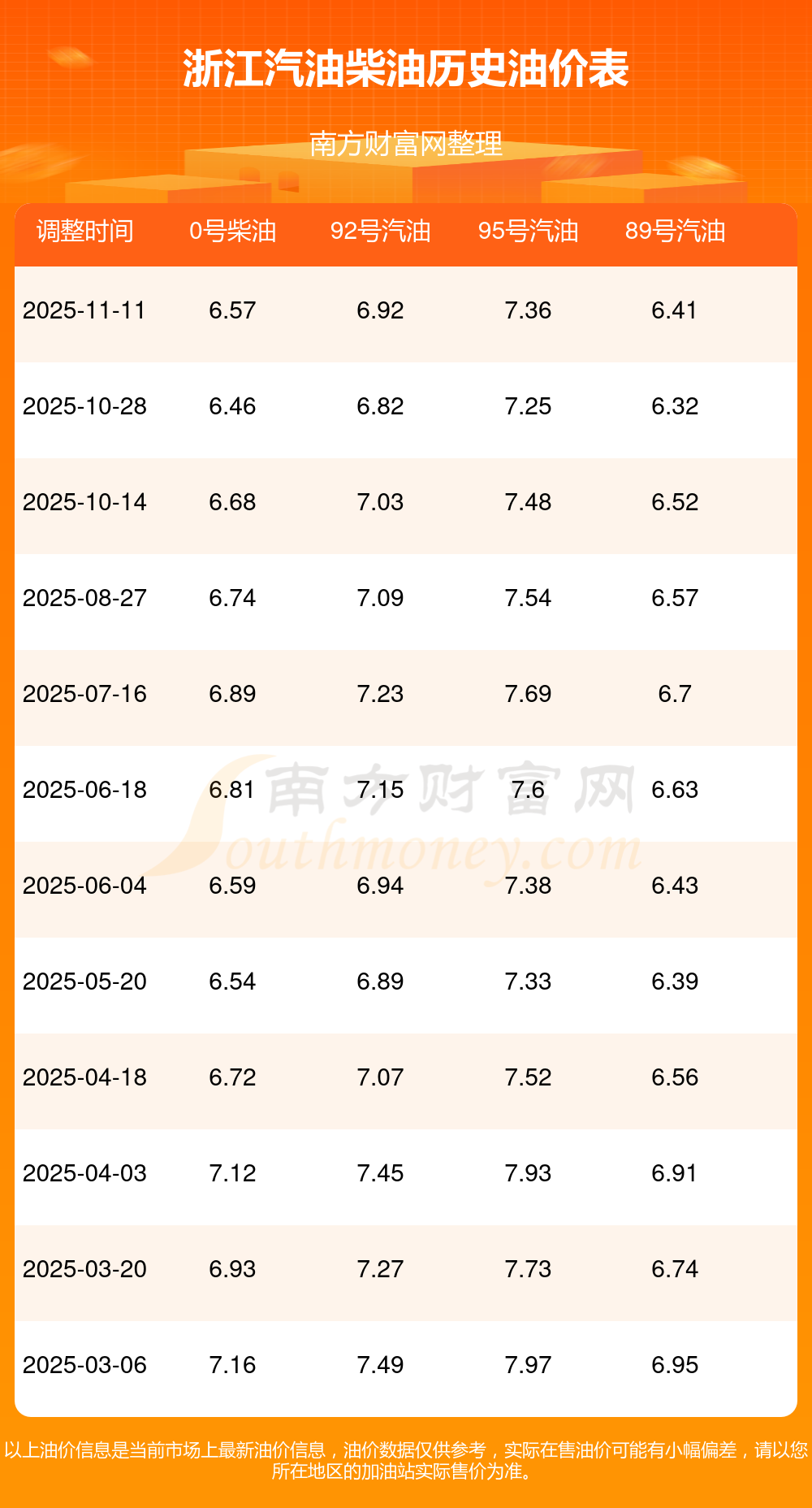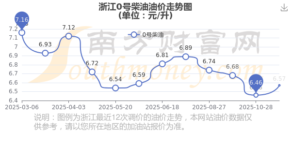 11月23日,浙江0号柴油的价格是6.57元每升,本次的调整时间为11月11日,对比上次的调整上调了0.11元,上调1.703%,下次调整时间为11月24日24时,还有1.84天。
