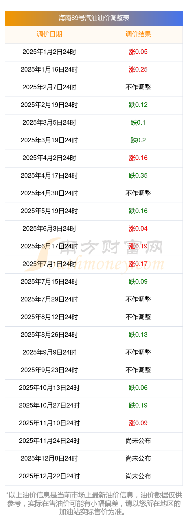 2025年海南最新汽油价格调整一览表