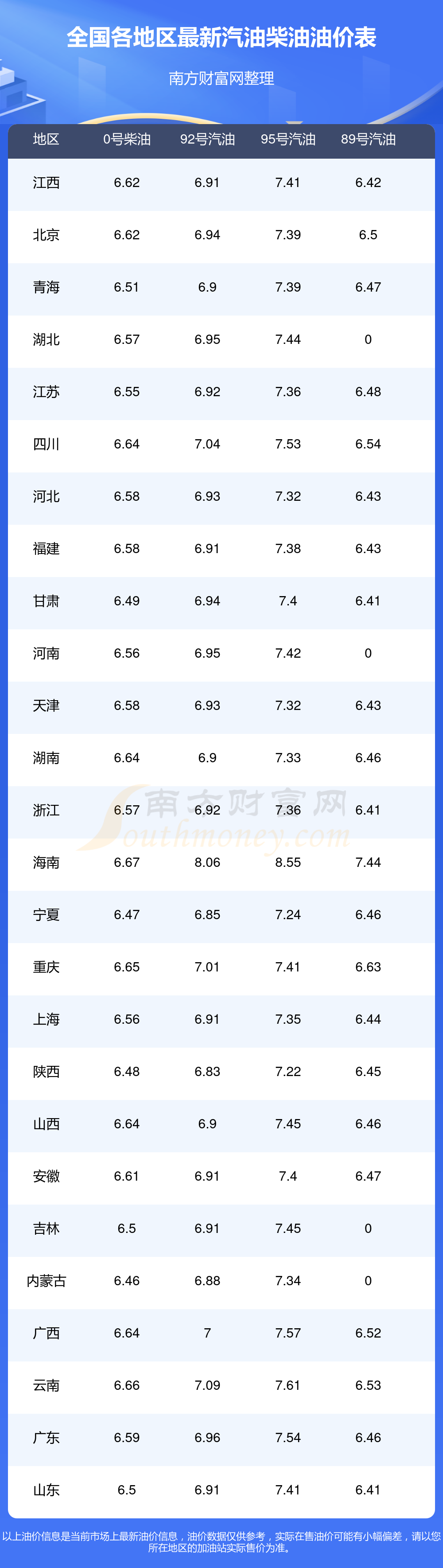 全国0号柴油最新平均价格为:7元每升,其中,最高为海南,价格为6.67元/升,最低为内蒙古,价格为6.46元/升。