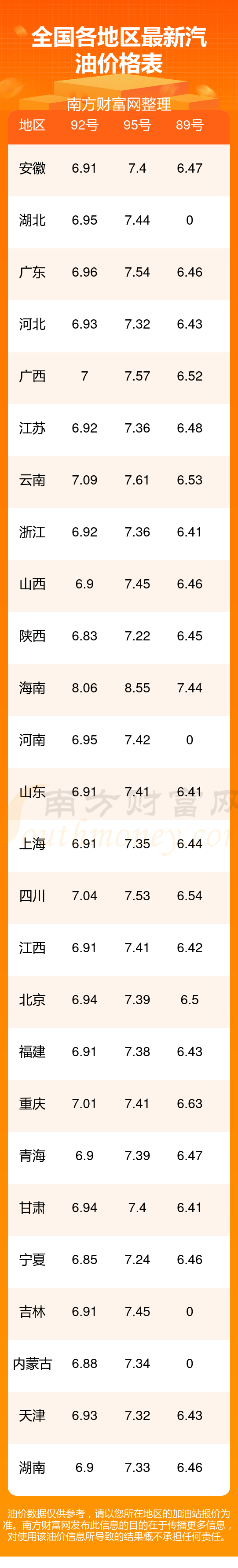 11月23日,全国92号汽油最新平均价格为7元每升(根据11月11日油价调整后计算),其中全国92号汽油最低为陕西,价格6.83元/升,92号汽油最高为海南,价格8.06元/升。下一轮油价调整时间11月24日24时,距离现在还有1.79天。