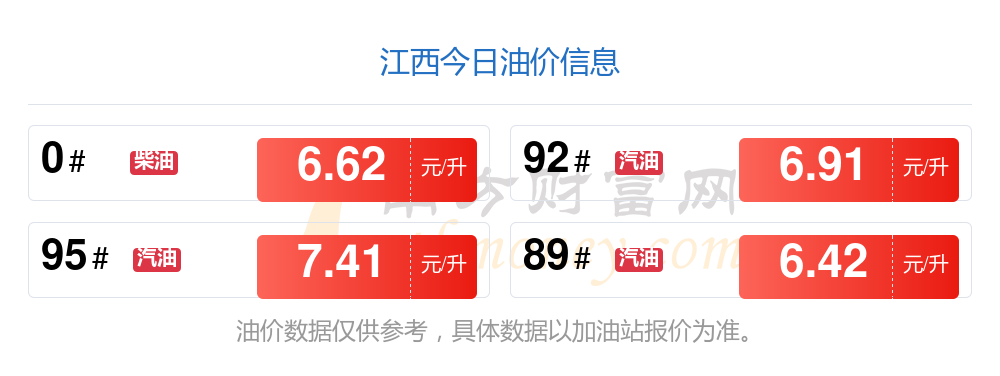 11月23日,江西89号汽油的价格是6.42元每升,本次的调整时间为11月11日,对比上次的调整涨了0.09元,涨1.422%,11月24日24时为下一轮油价调整时间,还有1.79天。