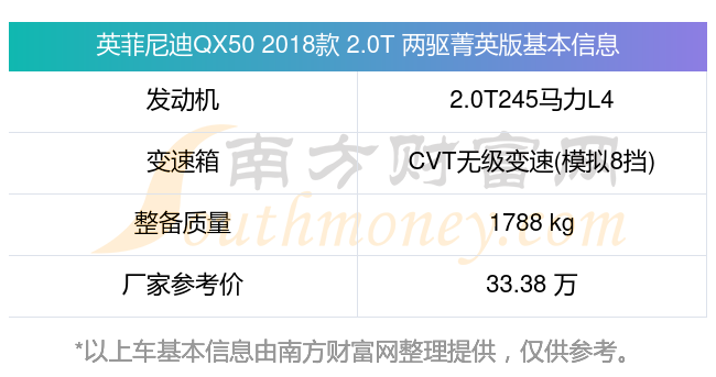 英菲尼迪QX50 2018款 2.0T 两驱菁英版动力上搭载的是一台2.0T245马力L4涡轮增压发动机,匹配CVT无级变速(模拟8挡)自动档变速箱,燃料形式为汽油,常规整备质量1788kg,厂家参考价33.38万元。