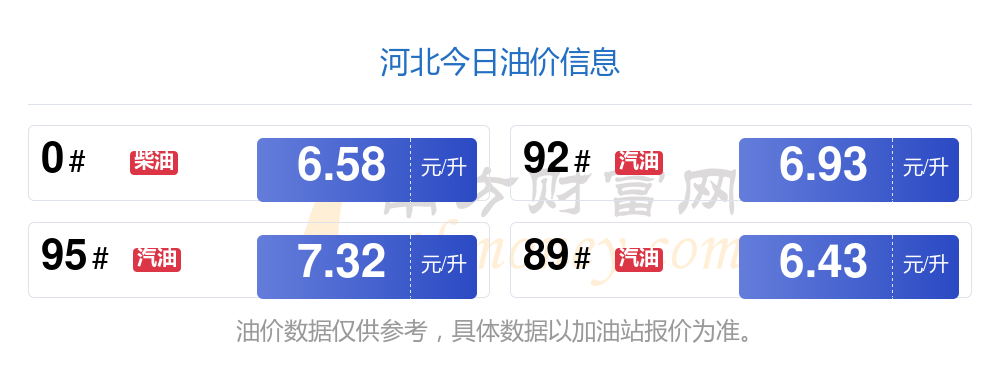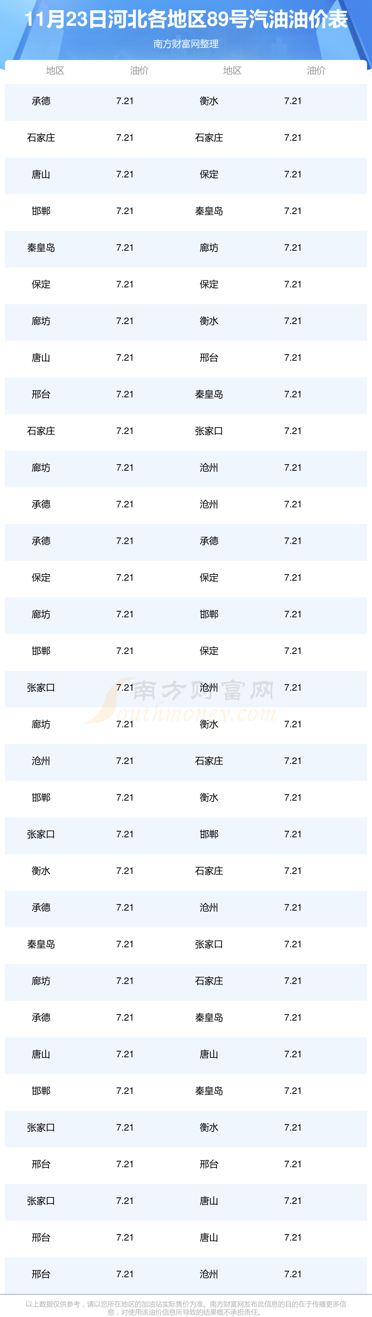 11月23日,河北89号汽油的价格是6.43元每升,本次的调整时间为11月11日,对比上次的调整涨了0.1元,涨1.58%,11月24日24时为下一轮油价调整时间,还有1.78天。